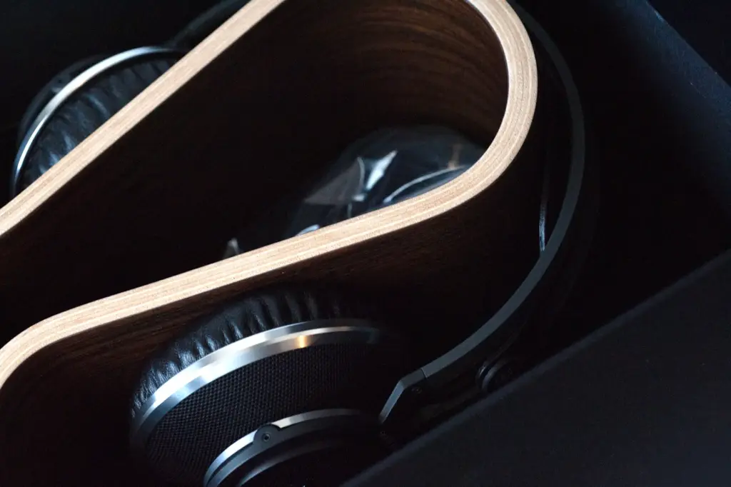 箱を開けると、工作精度が難しそうな何枚も天然の木製素材を重ねて「曲げ」で作られたヘッドホンスタンドに、黒くてツヤツヤした何かが埋まっていました。